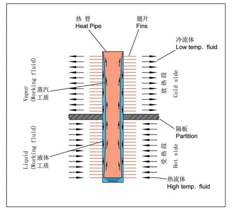 熱管是一種具有高傳熱性能元件,它通過密閉真空管殼內(nèi)工作介質(zhì)的相變潛熱來(lái)傳遞能量,其傳熱性能類似于超導(dǎo)體性能,因此它具有傳熱能力大,傳熱效率高的特點(diǎn)。